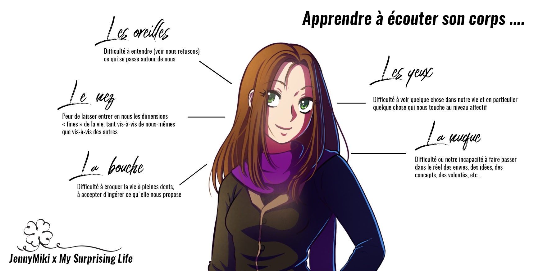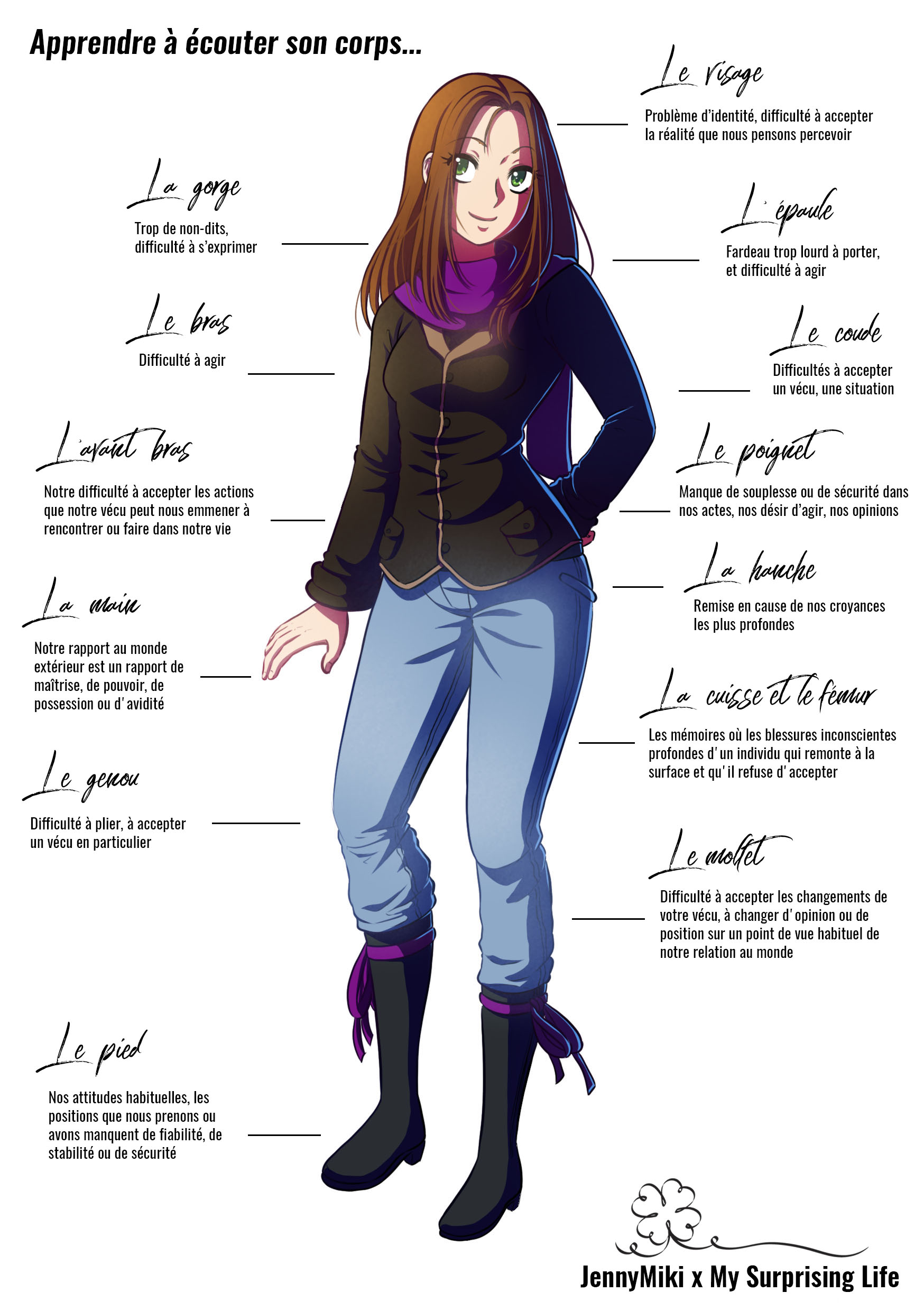 Vous trouverez, en fin d’article, des visuels réalisés en collaboration avec JennyMiki, qui détaille chaque partie du corps et ses significations ! Vous pouvez l’imprimer et le laisser dans votre carnet, votre phase de recherche sera encore plus efficace !