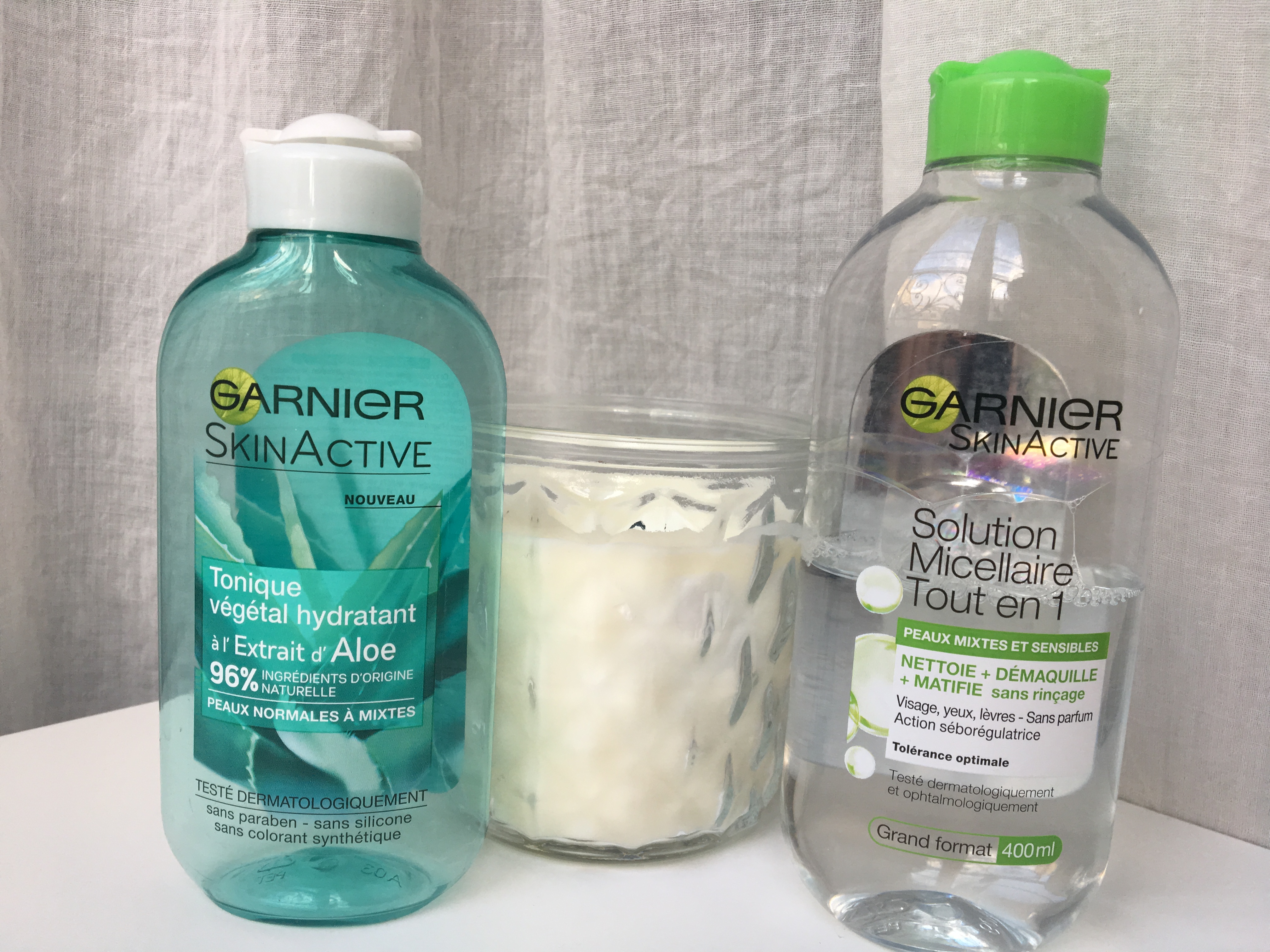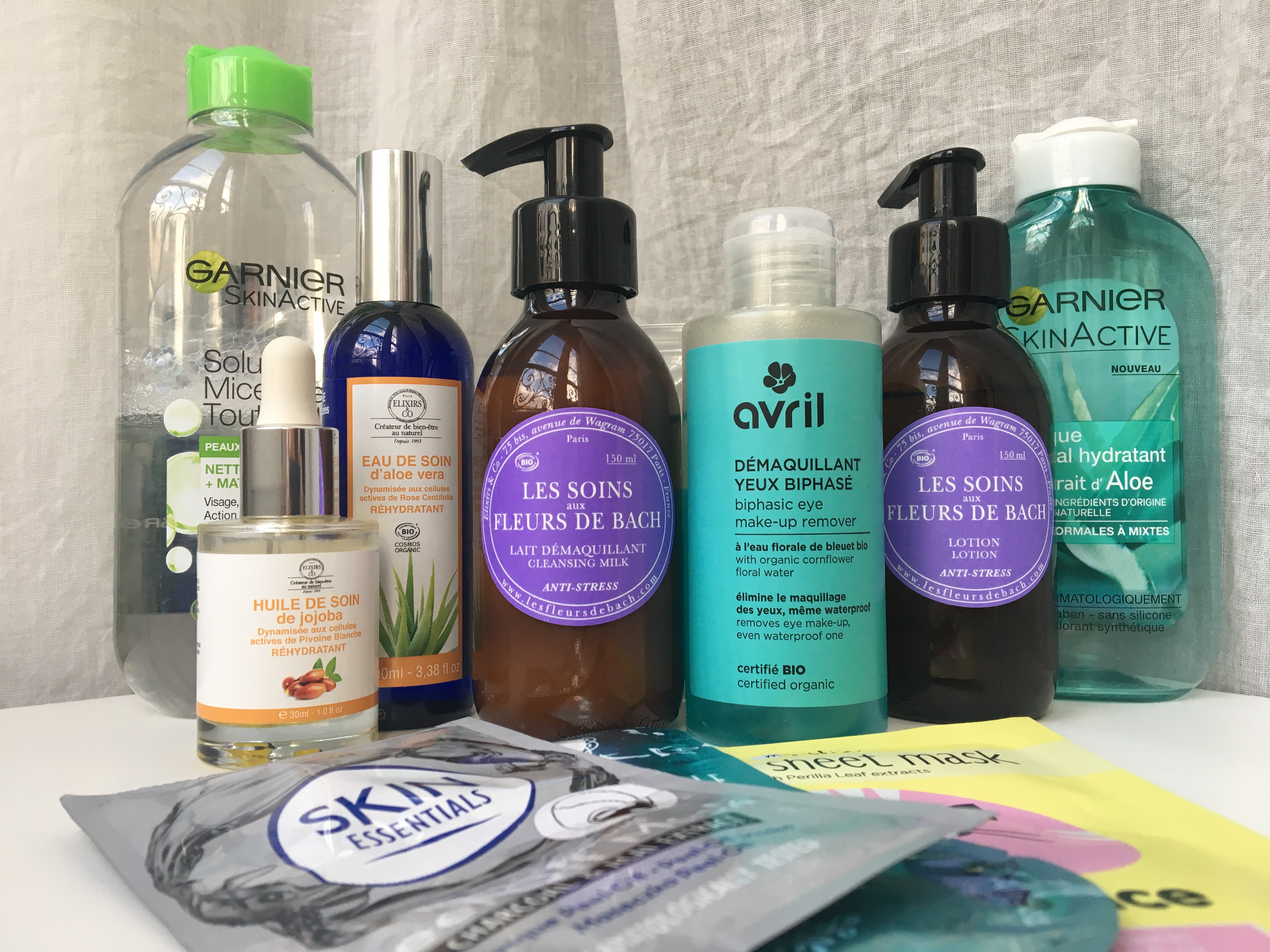 Après avoir nettoyé mon visage avec l’eau micellaire (le coton est souvent gris d’ailleurs !), j’utilise le lait démaquillant et la lotion aux fleurs de bach en duo. Il s’agit de la même utilisation que le matin.