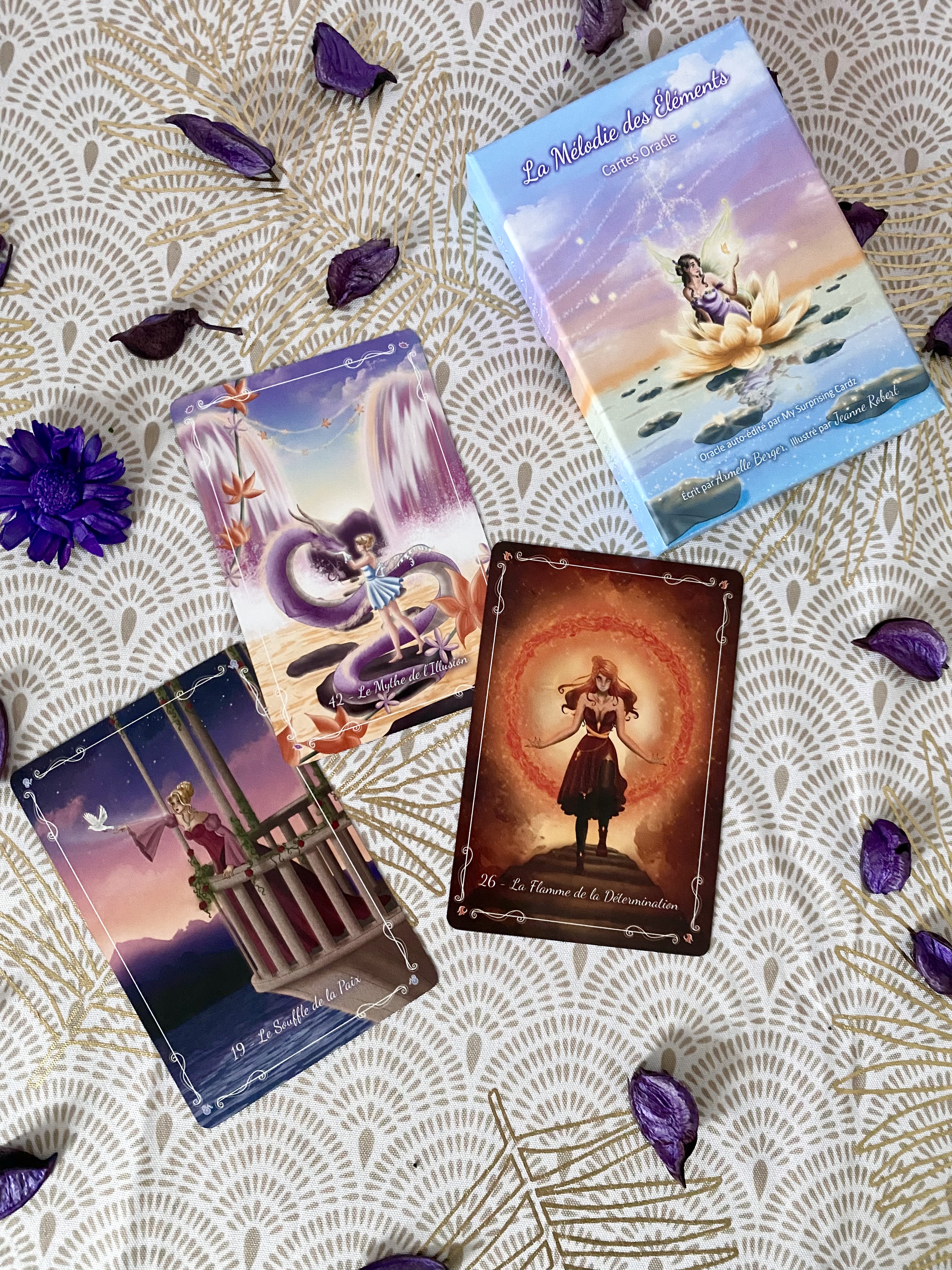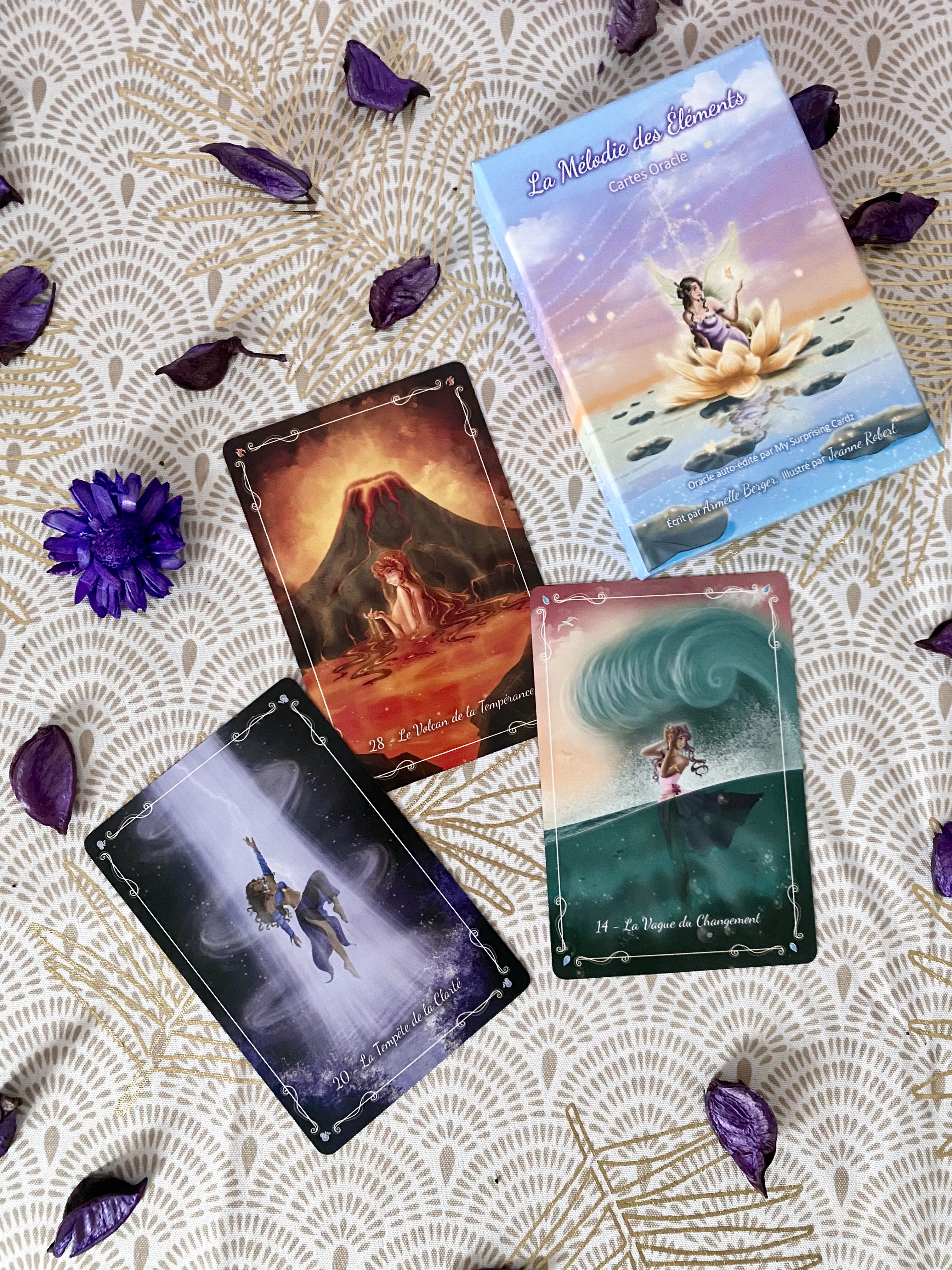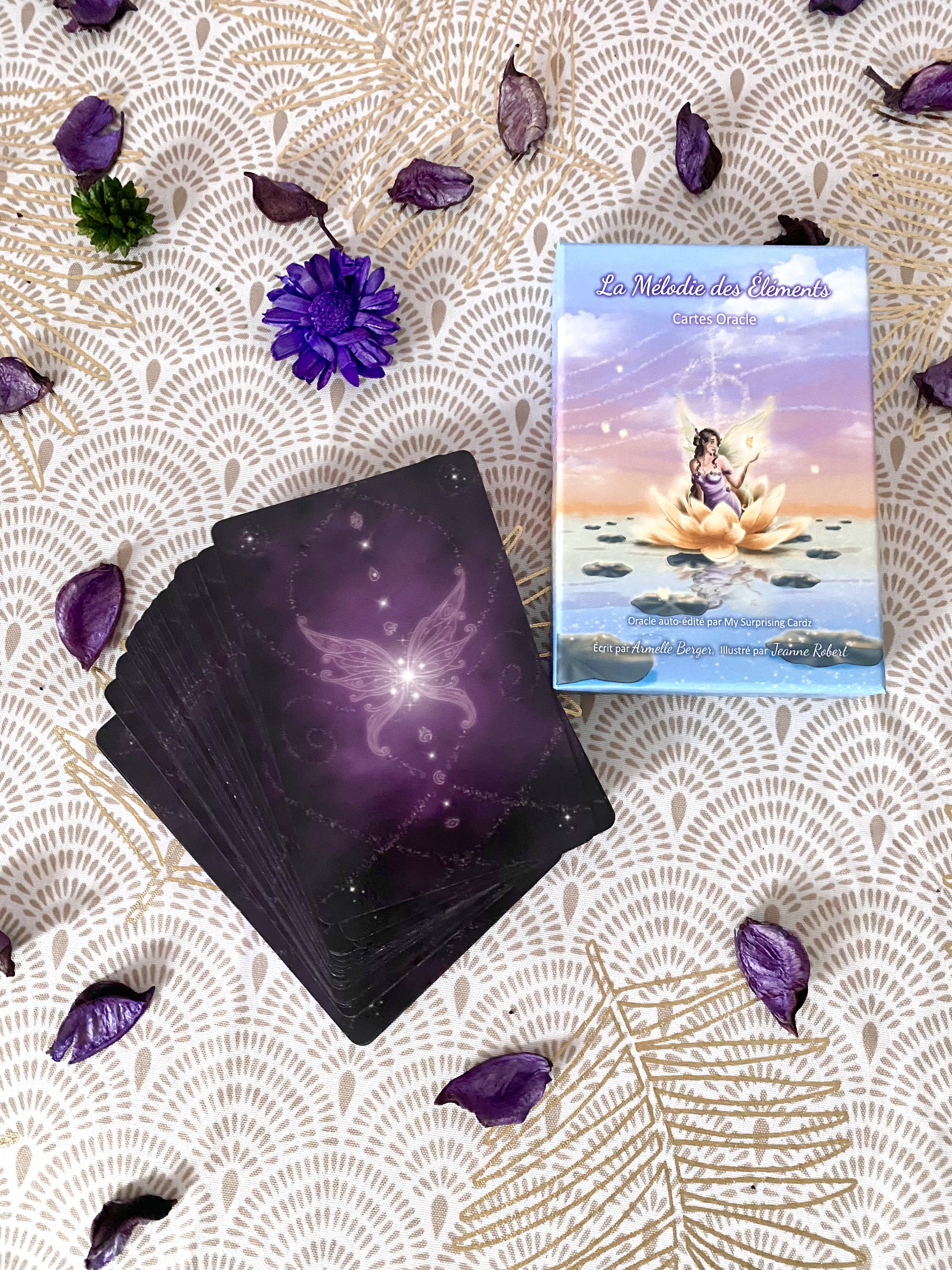L’oracle « La Mélodie des Éléments » te plonge au cœur des 6 éléments : la Terre, l’Eau, l’Air, le Feu, l’Espace et l’Esprit. Complémentaires, ils t’apporteront les messages que tu as besoin de recevoir et les réponses aux questions que tu te poses. Tu peux aborder tout sujet qui te tient à cœur, tes cartes répondront sans tabou et avec bienveillance. Très intuitif, cet oracle qui dispose de plusieurs niveaux de lecture, est accessible à tous, débutants comme cartomanciens expérimentés. Le secret pour bien interpréter tes cartes : fais-toi confiance et laisse-toi porter par ton intuition !