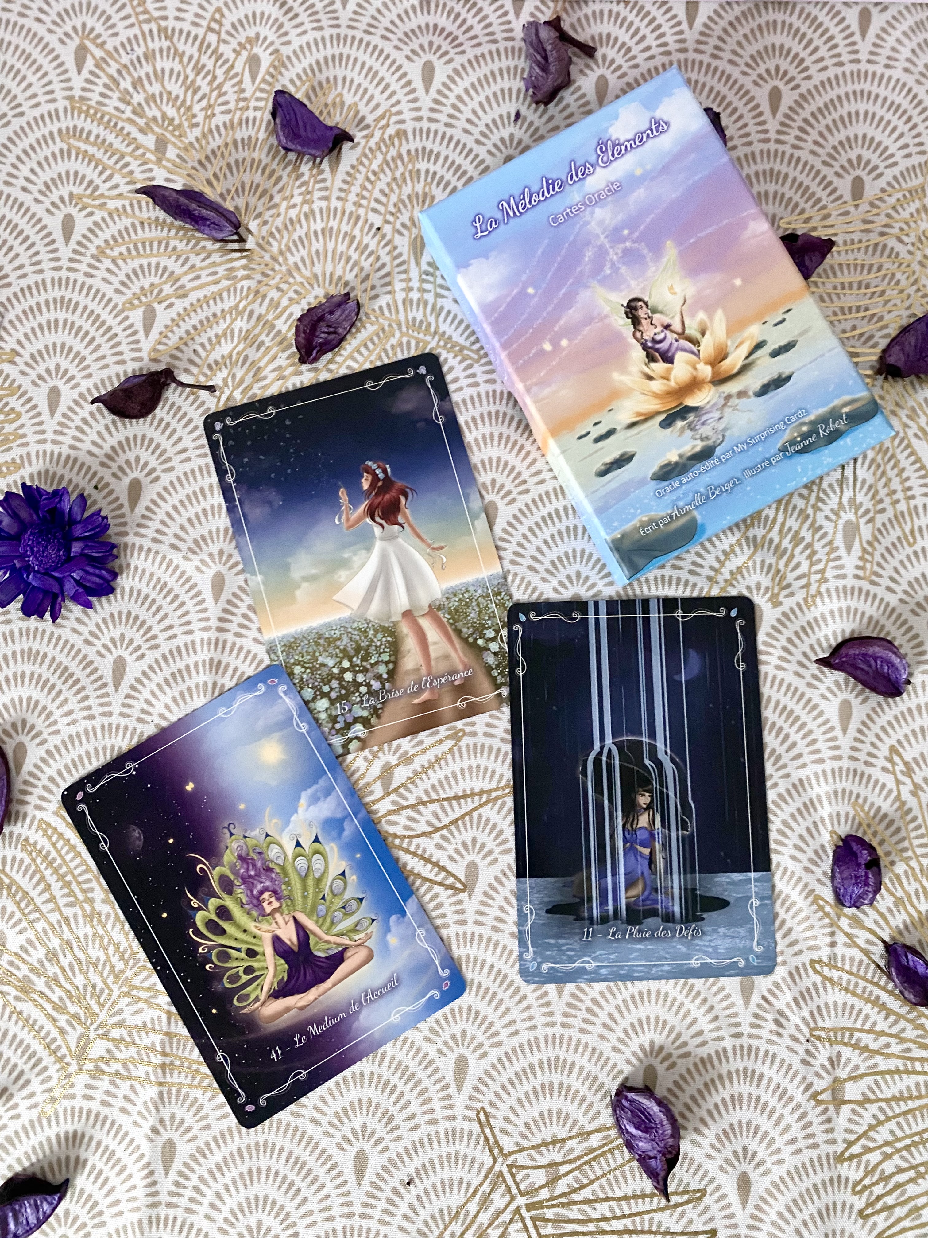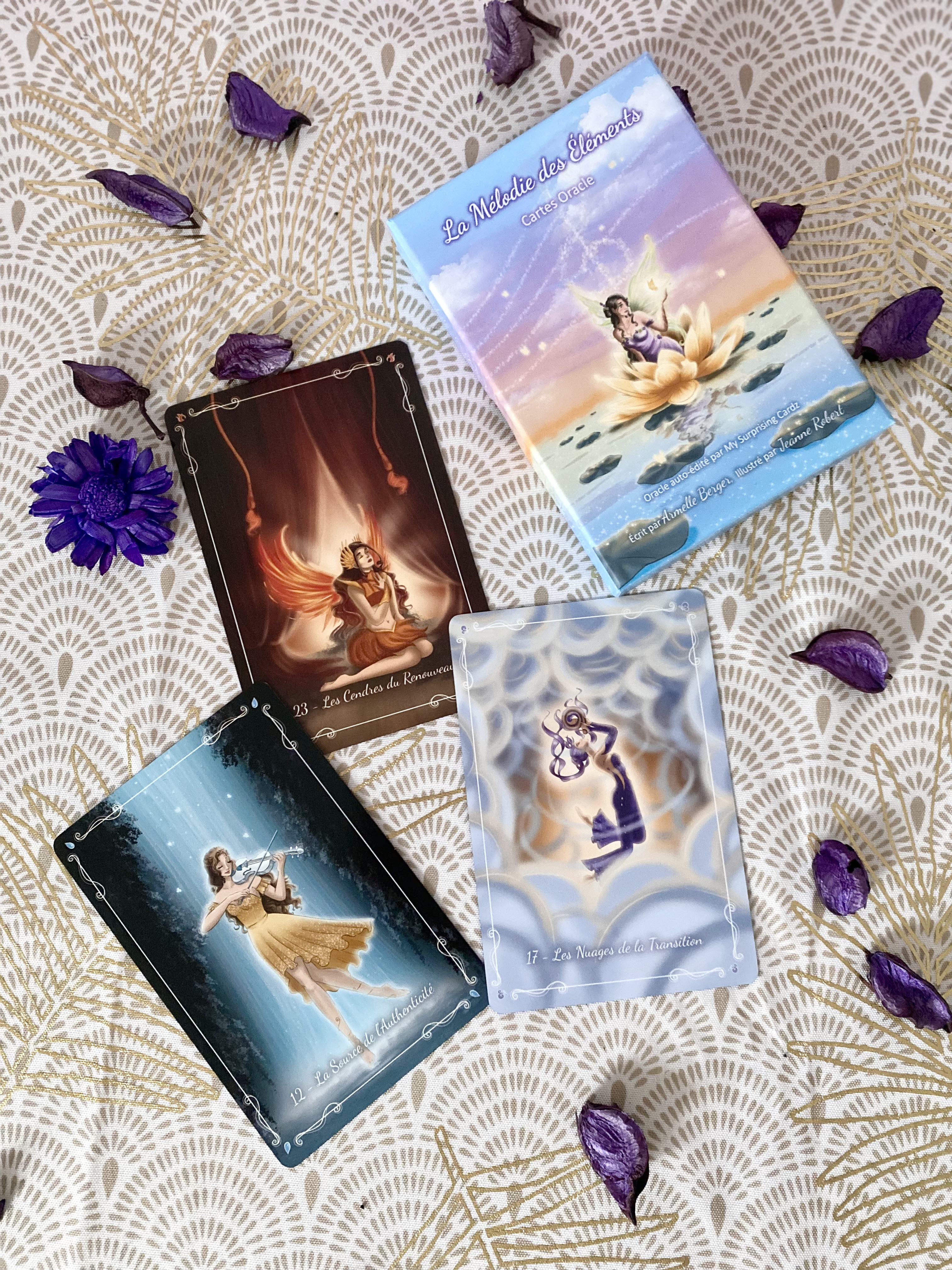 L’oracle La Mélodie des Éléments est la nouvelle édition de notre tout premier oracle « Les Mystérieuses Vibrations des Éléments« . Le thème et la structure de l’oracle restent identiques (7 cartes par élément + la carte « La Fée Gardienne ») ainsi que les titres des cartes.